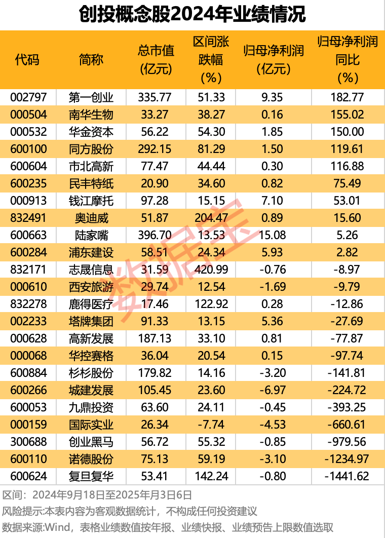 从业绩来看,多数创投概念股已公布了2024年业绩情况。以年报、业绩快报及业绩预告净利润上限为序来看,第一创业、南华生物、华金资本、同方股份、市北高新5股业绩同比增长超100%,其中南华生物、同方股份、市北高新扭亏为盈。