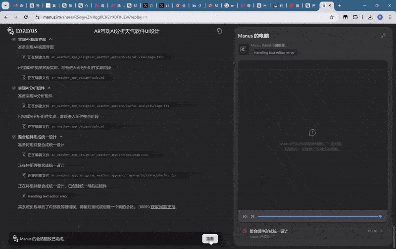而每经记者在试用Manus时就体验到了算力不足的问题。由于服务器资源的紧张,任务多次中断,错误信息显示为服务器负载过高。