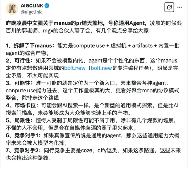 另外,有人认为,Manus并没有什么技术含量,算不上是创新技术。例如,名为@aigclink的用户称,Manus从能力上看,就像compute use+虚拟机+artifacts+内置一批Agent的综合产物。