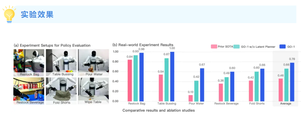 从性能来看,GO-1相比已有模型成功率大幅领先,平均成功率提高了32%。经实验发现,GO-1在“倒水”“清理桌面”“补充饮料”等任务中表现相对突出。