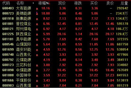 煤炭、电力、燃气、石油、钢铁等资源股盘中集体拉升。截至收盘,煤炭板块方面,大有能源、美锦能源涨停,新集能源涨超8%,晋控煤业、郑州煤电涨近7%。