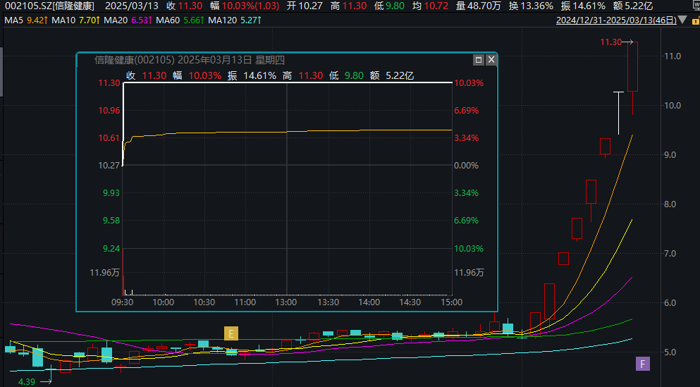 今日,信隆健康(002105)开盘2分钟内迅速拉升涨停,斩获8连板。截至收盘,报11.3元/股,成交额5.22亿元,涨停板上封单超10万手。昨日,该股盘中曾开板,成交额明显放大,全日成交12.3亿元。