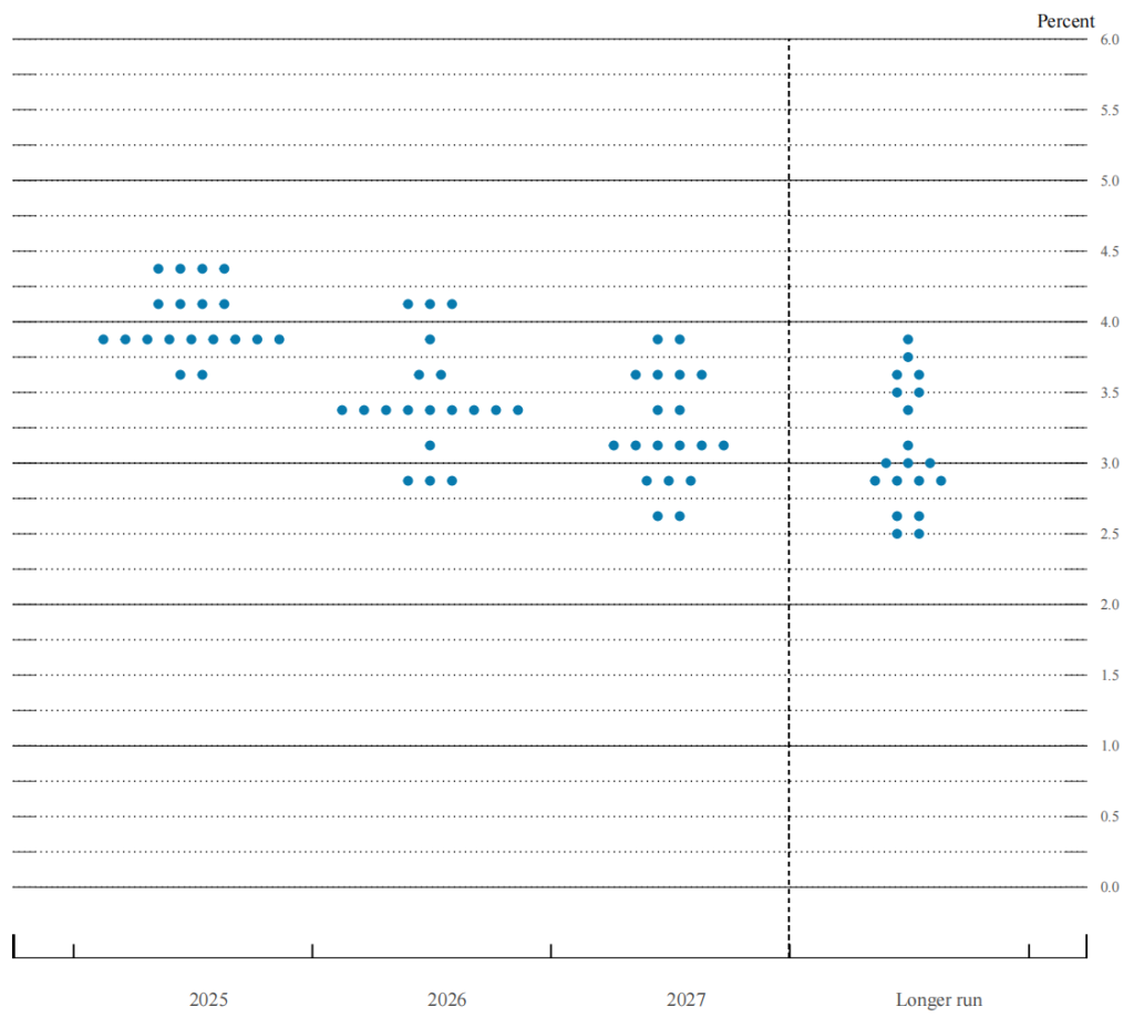 点阵图显示,美联储维持了去年12月对今年2次降息的预测。具体来看,对2025年的联邦基金利率,利率中值预测维持在3.9%。对2026年的联邦基金利率,利率中值维持在3.4%。长期中性利率预期值维持在3%。此前的2024年12月,美联储在降息的同时同步上调了2025年、2026年的联邦基金利率水平。