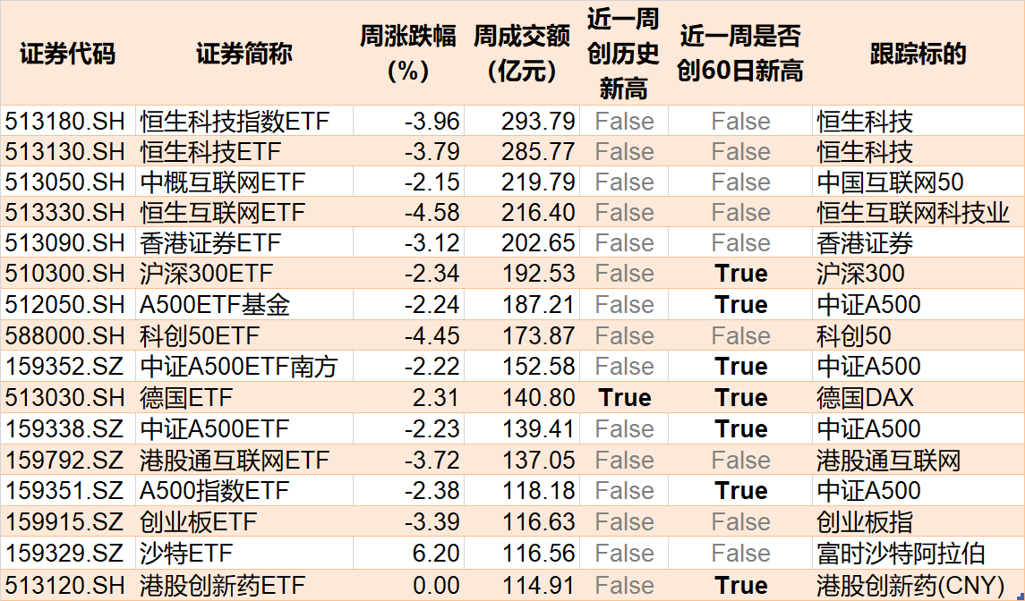 本周股票型ETF和跨境型ETF成交额超200亿元的有5只。