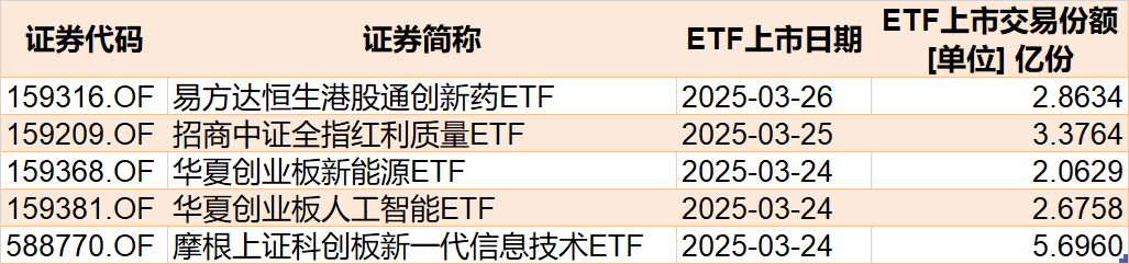 目前有5只ETF披露下周上市,跟踪标的有科创新一代信息技术、创业板人工智能、创业板新能源、红利质量和港股通创新药。