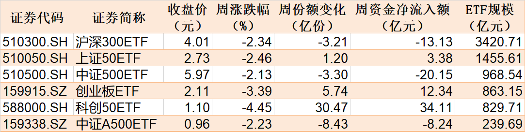 本周市场主要股指集体调整,6只主要指数ETF中,科创50ETF跌超4%。