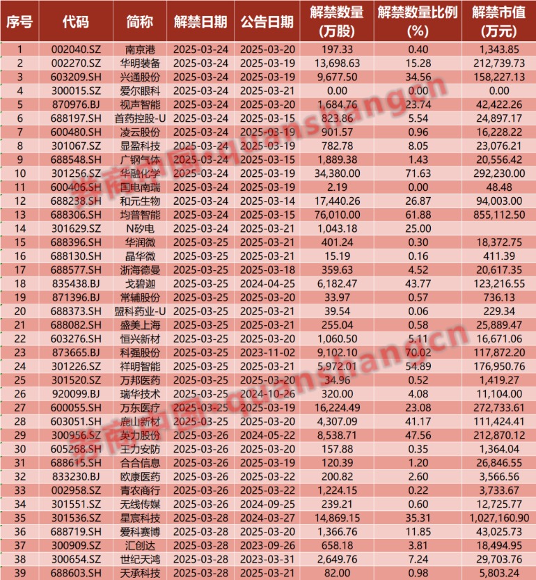 数据显示,本周(3月24日到3月28日)A股市场将有39只股票面临限售股解禁,合计解禁数量为23.29亿股;按最新收盘价计算,合计解禁市值为402.38亿元。从解禁股情况来看,星宸科技将解禁市值超100亿元,均普智能将解禁市值超80亿元。