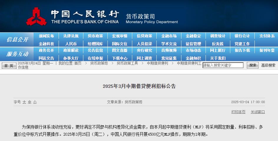 为保持银行体系流动性充裕,更好满足不同参与机构差异化资金需求,自本月起中期借贷便利(MLF)将采用固定数量、利率招标、多重价位中标方式开展操作。2025年3月25日(周二),中国人民银行将开展4500亿元MLF操作,期限为1年期。
