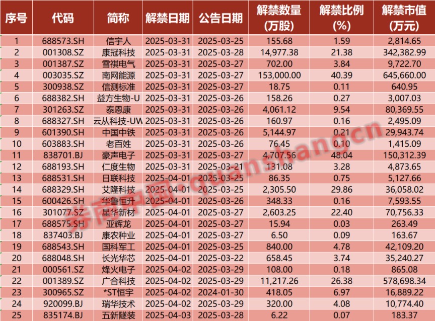 本周(3月31日—4月4日)A股市场将有25只股票面临解禁,合计解禁数量为20.22亿股,按最新收盘价计算,合计解禁市值为207.84亿元。从解禁股情况来看,南网能源将解禁市值超60亿元,广合科技将解禁市值超50亿元。