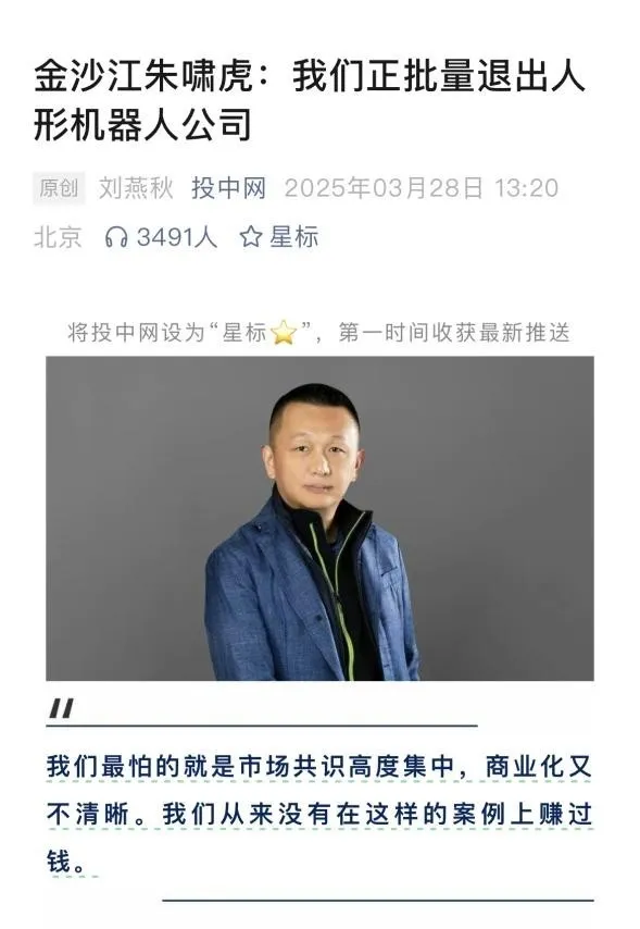 此后,作为创业者代表的众擎机器人创始人、董事长赵同阳公开发表观点,“回怼”朱啸虎。他表示“我认为他比较适合那种今年投入后年就见效的快餐式项目,AI和人形机器人都不是能让他快速赚钱的项目,人形机器人在五年之内几乎无处不在,是人类学会制造工具以来最刺激的一次工业革命”。3月29日,金沙江创投曾经的被投企业、机器人公司星海图也发布了与该机构合作始末的澄清公告,并呼吁具身智能赛道长坡厚雪,行业的发展离不开社会各方各界的持续关注与鼎力支持。