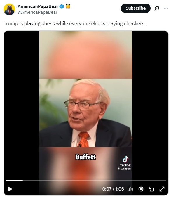 据央视新闻,当地时间4月4日,美国总统特朗普通过社交媒体“真实社交”转载了一段原本发布在TikTok、后又被搬运至社交媒体X的视频。该视频以“幻灯片+配音解说”的形式,称美国著名投资人、“股神”沃伦·巴菲特支持特朗普政府的关税计划。