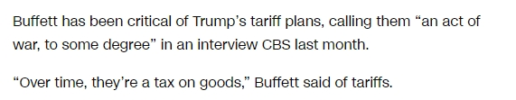另据美国有线电视新闻网(CNN)报道,巴菲特一直对特朗普的关税计划持批评态度,曾在上个月的采访中称其为“某种程度上的战争行为”。