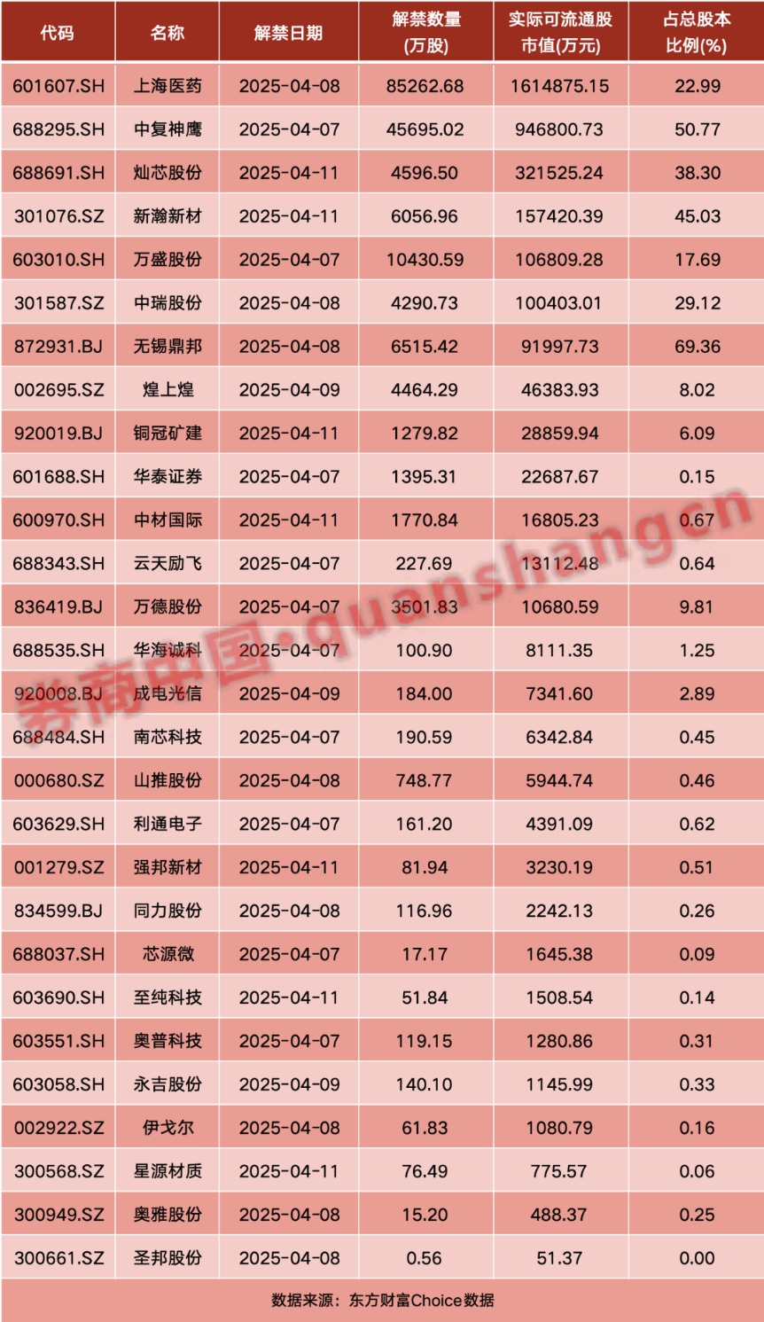 数据显示,本周(4月7日~4月11日)共有28家公司限售股陆续解禁,合计解禁量17.76亿股,按4月3日收盘价计算,解禁市值为352.39亿元。