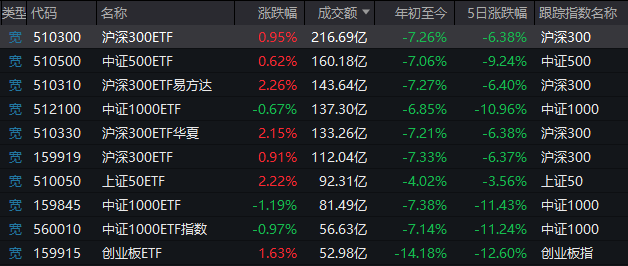 沪深300ETF(510300)成交额较昨日略减,为216.69亿。但另外3只千亿级的沪深300ETF(分属易方达、华夏和嘉实三家基金公司旗下),成交额进一步放大。