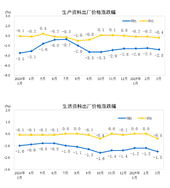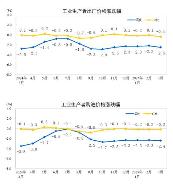 2025年3月份,全国工业生产者出厂价格同比下降2.5%,环比下降0.4%;工业生产者购进价格同比下降2.4%,环比下降0.2%。一季度,工业生产者出厂价格和购进价格比上年同期均下降2.3%。