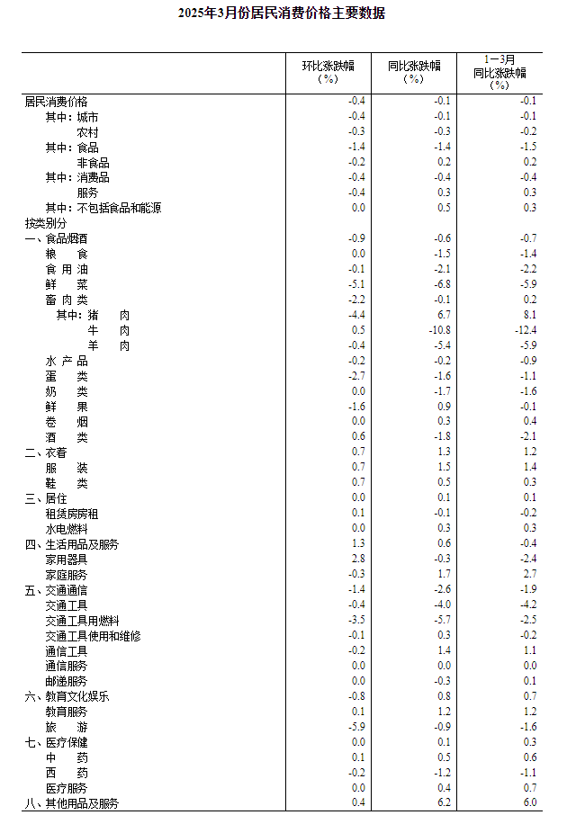 2025年3月份居民消费价格同比下降0.1%