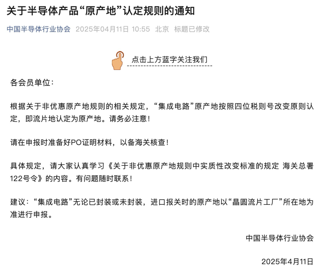 4月11日,中国半导体行业协会发布《关于半导体产品“原产地”认定规则的通知》称,根据关于非优惠原产地规则的相关规定,“集成电路”原产地按照四位税则号改变原则认定,即流片地认定为原产地。请在申报时准备好PO证明材料,以备海关核查。