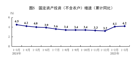一季度,全国固定资产投资(不含农户)103174亿元,同比增长4.2%,比上年全年加快1.0个百分点;扣除房地产开发投资,全国固定资产投资增长8.3%。分领域看,基础设施投资同比增长5.8%,制造业投资增长9.1%,房地产开发投资下降9.9%。全国新建商品房销售面积21869万平方米,同比下降3.0%,降幅比1-2月份收窄2.1个百分点;新建商品房销售额20798亿元,下降2.1%,降幅收窄0.5个百分点。分产业看,第一产业投资同比增长16.0%,第二产业投资增长11.9%,第三产业投资增长0.1%。民间投资增长0.4%;扣除房地产开发投资,民间投资增长6.0%。高技术产业投资同比增长6.5%,其中信息服务业、航空航天器及设备制造业、计算机及办公设备制造业、专业技术服务业投资分别增长34.4%、30.3%、28.5%、26.1%。3月份,固定资产投资(不含农户)环比增长0.15%。