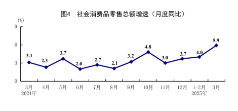 一季度,社会消费品零售总额124671亿元,同比增长4.6%,比上年全年加快1.1个百分点。按经营单位所在地分,城镇消费品零售额108057亿元,同比增长4.5%;乡村消费品零售额16614亿元,增长4.9%。按消费类型分,商品零售额110644亿元,增长4.6%;餐饮收入14027亿元,增长4.7%。基本生活类和部分升级类商品销售增势较好,限额以上单位粮油食品类、日用品类、体育娱乐用品类商品零售额分别增长12.2%、6.8%、25.4%。消费品以旧换新政策继续显效,限额以上单位通讯器材类、文化办公用品类、家用电器和音像器材类、家具类商品零售额分别增长26.9%、21.7%、19.3%、18.1%。全国网上零售额36242亿元,同比增长7.9%。其中,实物商品网上零售额29948亿元,增长5.7%,占社会消费品零售总额的比重为24.0%。3月份,社会消费品零售总额同比增长5.9%,比1-2月份加快1.9个百分点;环比增长0.58%。一季度,服务零售额同比增长5.0%。