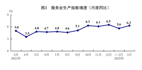 一季度,服务业增加值同比增长5.3%,比上年全年加快0.3个百分点。其中,信息传输、软件和信息技术服务业,租赁和商务服务业,交通运输、仓储和邮政业,批发和零售业,住宿和餐饮业增加值分别增长10.3%、10.2%、7.2%、5.8%、5.1%。3月份,全国服务业生产指数同比增长6.3%,比1-2月份加快0.7个百分点。其中,信息传输、软件和信息技术服务业,租赁和商务服务业,批发和零售业,住宿和餐饮业生产指数分别增长9.9%、9.3%、7.7%、6.0%。1-2月份,规模以上服务业企业营业收入同比增长8.2%,比上年全年加快1.0个百分点。3月份,服务业商务活动指数为50.3%,比上月上升0.3个百分点;服务业业务活动预期指数为57.5%,上升0.6个百分点。其中,水上运输、航空运输、邮政、电信广播电视及卫星传输服务、货币金融服务等行业商务活动指数位于55.0%以上较高景气区间。