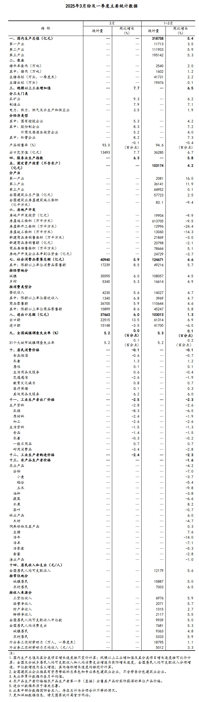 初步核算,一季度国内生产总值318758亿元,按不变价格计算,同比增长5.4%,比上年四季度环比增长1.2%。分产业看,第一产业增加值11713亿元,同比增长3.5%;第二产业增加值111903亿元,增长5.9%;第三产业增加值195142亿元,增长5.3%。