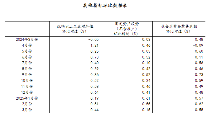 (2)根据季节调整模型自动修正结果,对近一年来各期国内生产总值、规模以上工业增加值、固定资产投资(不含农户)、社会消费品零售总额环比增速进行修订。修订结果及2025年一季度GDP环比数据、2025年3月份其他指标环比数据如下: