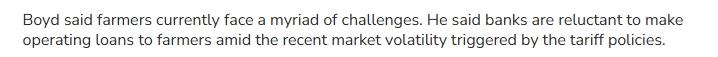 小约翰·博伊德表示,正是因为特朗普发起的贸易战,导致美国农民生产的商品在国际上的竞争力下降,让国际买家转向其他国家的农产品。与此同时,特朗普的关税政策还让不少农场主陷入贷款困境,因为在当前的情势下,出于风险提高的因素,银行普遍不愿再为农民们提供贷款服务。