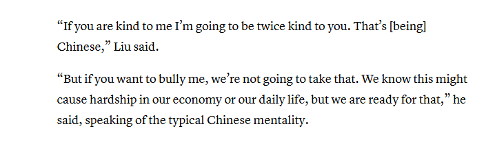 按照英文直译,这句话可以简单翻译成“你对我好,我也对你好。”布鲁斯·刘解释说:“但如果你想欺负我,我们不会接受。我们知道这可能会给我们的经济或日常生活带来影响,但我们已经为此做好了准备。”