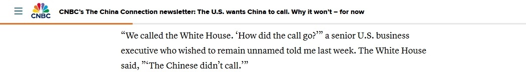 美国消费者新闻与商业频道(CNBC)4月16日就此刊发一篇评论文章,文章标题中直接说明:美国希望中国来电。但中方不会,起码现在不会。