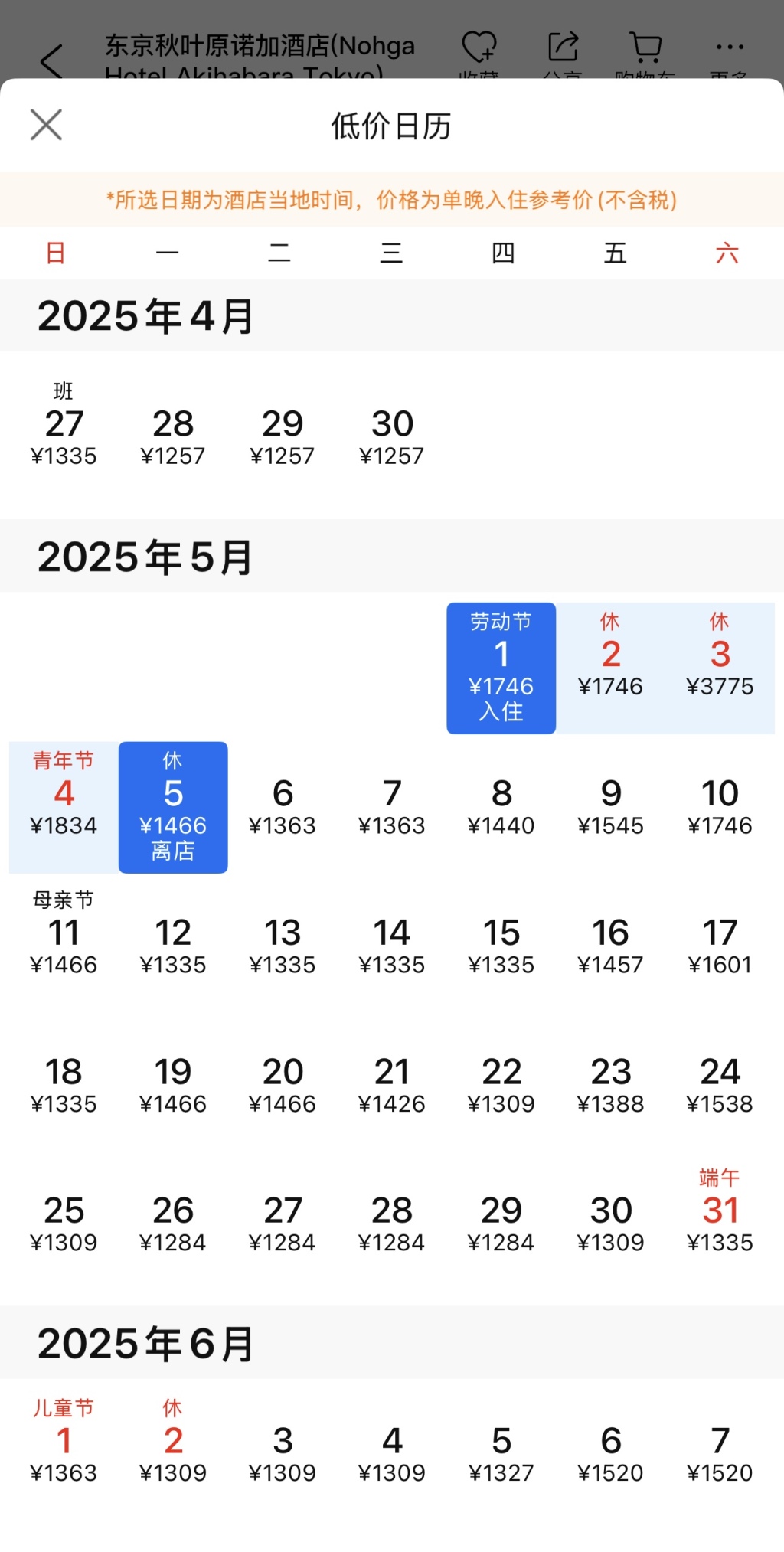 以东京为例,位于东京塔附近的东京皇家王子大饭店5月3日的客房最低价格为3253元(人民币,下同),与5月6日的1799元相比,价格涨幅约81%;位于秋叶原电器步行街附近的东京秋叶原诺加酒店5月3日的客房最低价格为3775元,与5月6日的1363元相比,价格涨幅约177%。