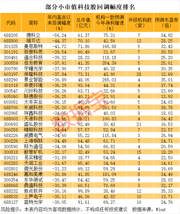 证券时报·数据宝筛选出超跌小盘优质科技股,条件包括年内高点以来回调幅度超30%、评级机构数在3家及以上、市值低于百亿元、机构一致预测今年净利增速超30%且预测市盈率低于40倍的个股,合计有31只。