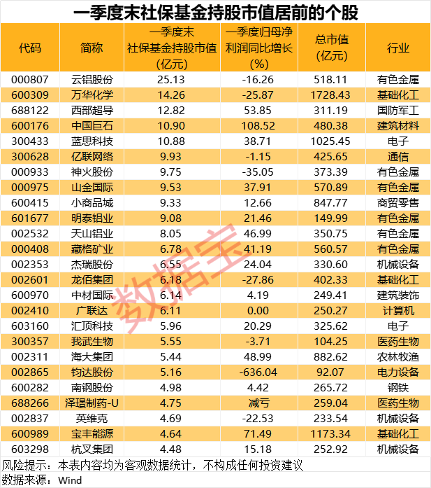 据证券时报·数据宝统计,根据已披露的公告,一季度末社保基金共现身113只个股前十大流通股东名单,合计持股市值达到323.48亿元。其中,云铝股份社保基金持股市值居于首位,达到25.13亿元;万华化学、西部超导、中国巨石、蓝思科技社保基金持股市值均在10亿元以上。
