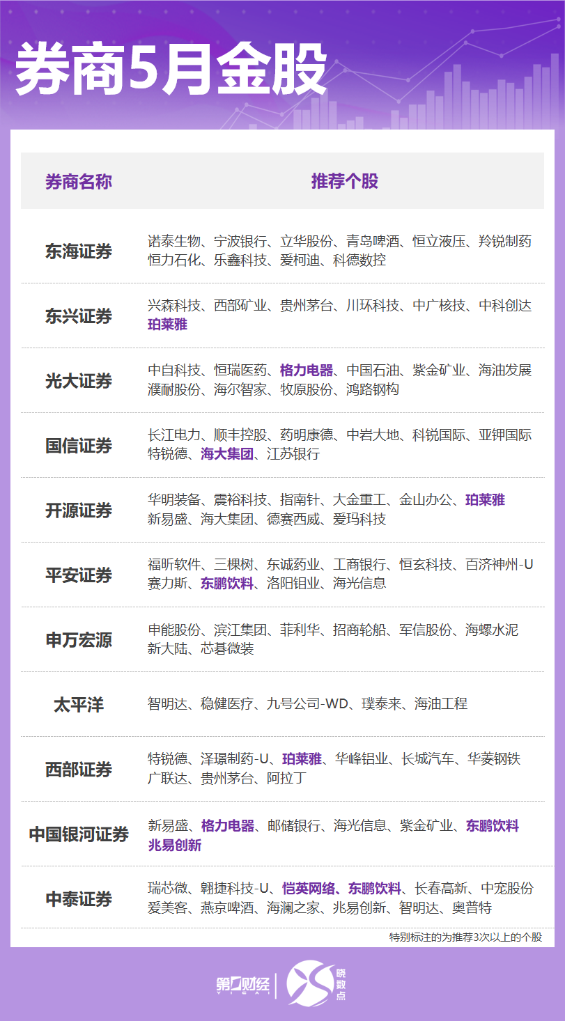 4月A股市场整体先抑后扬,上证指数累计跌1.7%,深证成指跌5.75%,创业板指跌7.4%。5月如何寻找机会?截至发稿,10余家券商公布了5月月度投资组合,涉及消费、能源、科技、金融等多个领域。