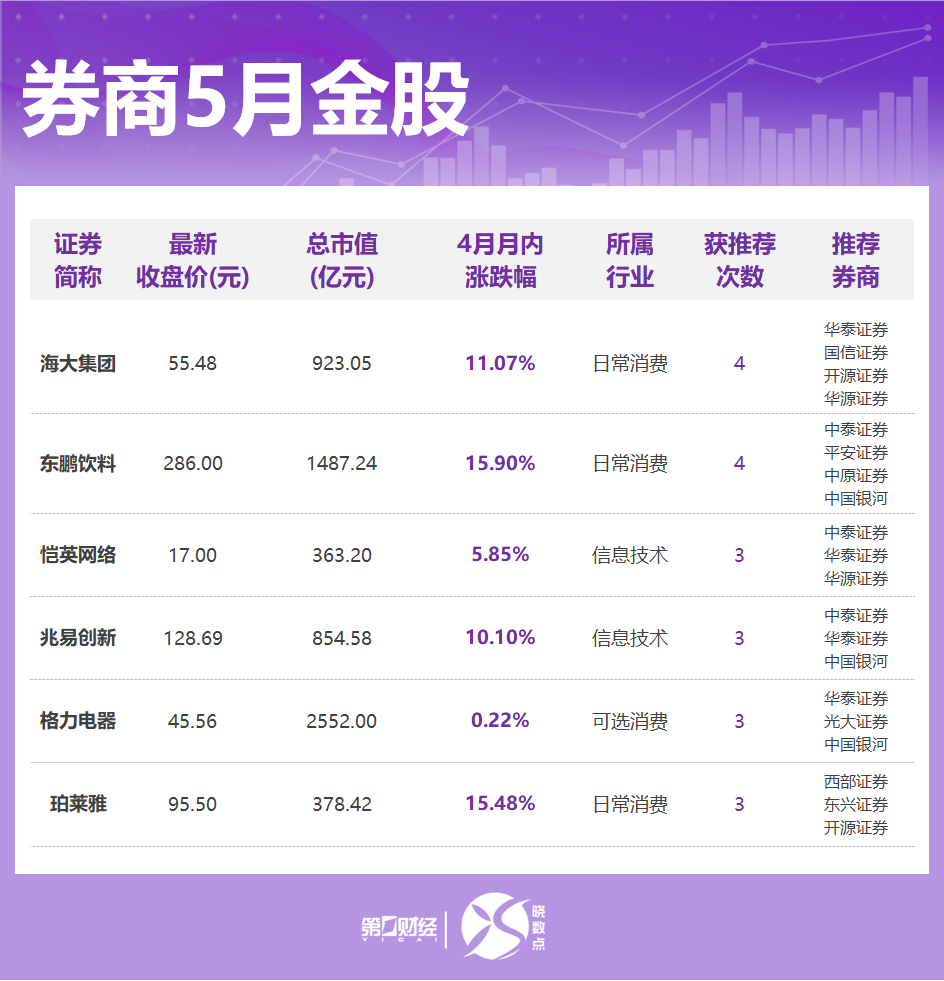 据不完全统计,在各家券商的“金股”名单中,获机构推荐次数最多的是海大集团、东鹏饮料,均获得4家券商的推荐。恺英网络、兆易创新、格力电器、珀莱雅等4股均获3家券商推荐。