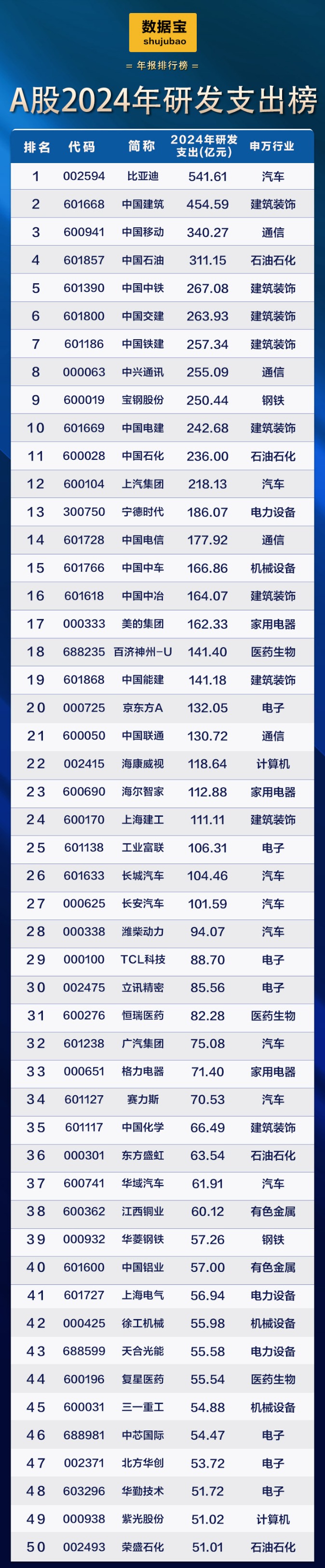 27家公司研发支出超百亿元,比亚迪、中国建筑、中国移动、中国石油、中国中铁排名前五。比亚迪2024年研发支出达到541.61亿元,A股历史上首次跻身榜首位置。2024年,公司实现营业总收入7771.02亿元,同比增长29.02%;实现归母净利润402.54亿元,同比增长34%。报告期内,公司新能源汽车销量同比增长超40%,市占率提升至33.2%。公司持续发力新产品研发,其中3D打印机、AI服务器于年内实现量产,液冷和电源产品完成开发,为业务增长注入新动力。