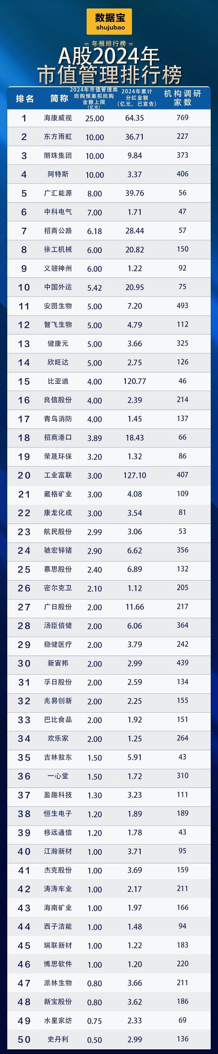 基于上述分析,数据宝在2024年盈利超1亿元的A股公司中,按2024年(统计口径为预案日)发布的市值管理类回购预案公告回购金额上限超5000万元、2024年累计分红金额(已宣告)超1亿元、2024年机构调研家数超40家三个条件进行筛选,50只市值管理潜力股浮出水面。