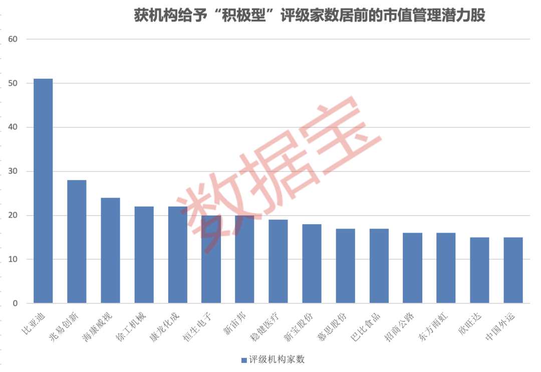 据数据宝统计,50只市值管理潜力股中,有40只个股获5家以上机构积极型评级(买入和增持评级)。