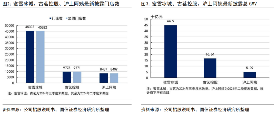 其次,三家公司门店均以加盟店为主,蜜雪冰城全球门店数达4.5万家,远高于古茗控股及沪上阿姨。古茗控股2024年第三季度末共有9778家门店,沪上阿姨2024年第二季度末共有8437家门店。三家公司旗下门店均以加盟店为主,仅有小部分直营门店。