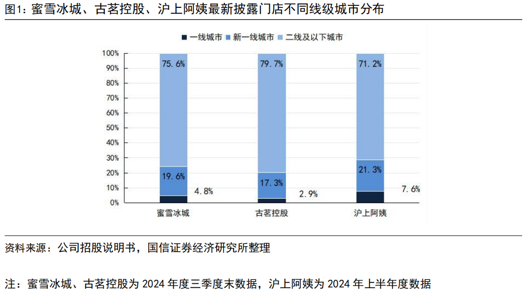第三,三家品牌门店均主要布局在二线及以下城市, 其中古茗在该线级城市门店占比最高(79.7%)>蜜雪冰城(71.2%)>沪上阿姨(71.2%)。
