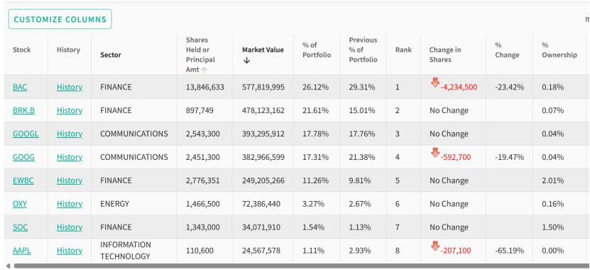 截至一季度末,李录的组合中共有8只股票,分别为美国银行、伯克希尔、谷歌A、谷歌C、华美、西方石油、SOC、苹果,期末持股市值分别为5.78亿美元、4.78亿美元、3.93亿美元、3.83亿美元、2.92亿美元、7239万美元、3407万美元、2457万美元。