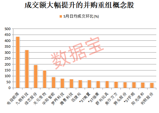 从成交情况来看,据数据宝统计,截至5月19日收盘,24只并购重组概念股5月以来日均成交额环比增幅逾20%。