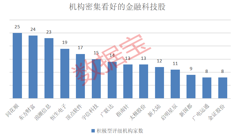 据证券时报·数据宝统计,A股金融科技板块中,有14股获8家及以上机构积极型评级。其中,金证股份和宇信科技在2024年年报披露后,获券商出具了包含“金融科技”的业绩点评分析报告。