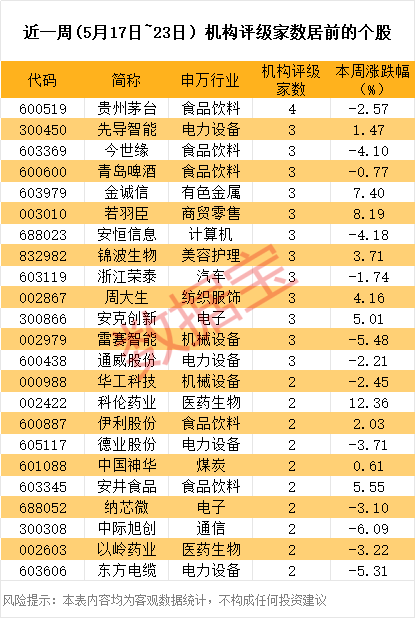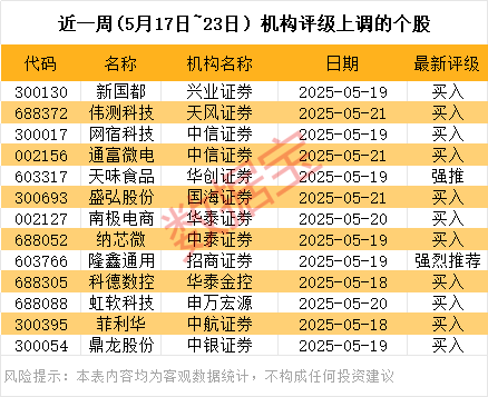 据证券时报·数据宝统计,近一周(5月17日~23日),合计有53家机构进行了501次评级,共计424股被券商研报给予“买入型”评级(包括买入、增持、强烈推荐、推荐)。