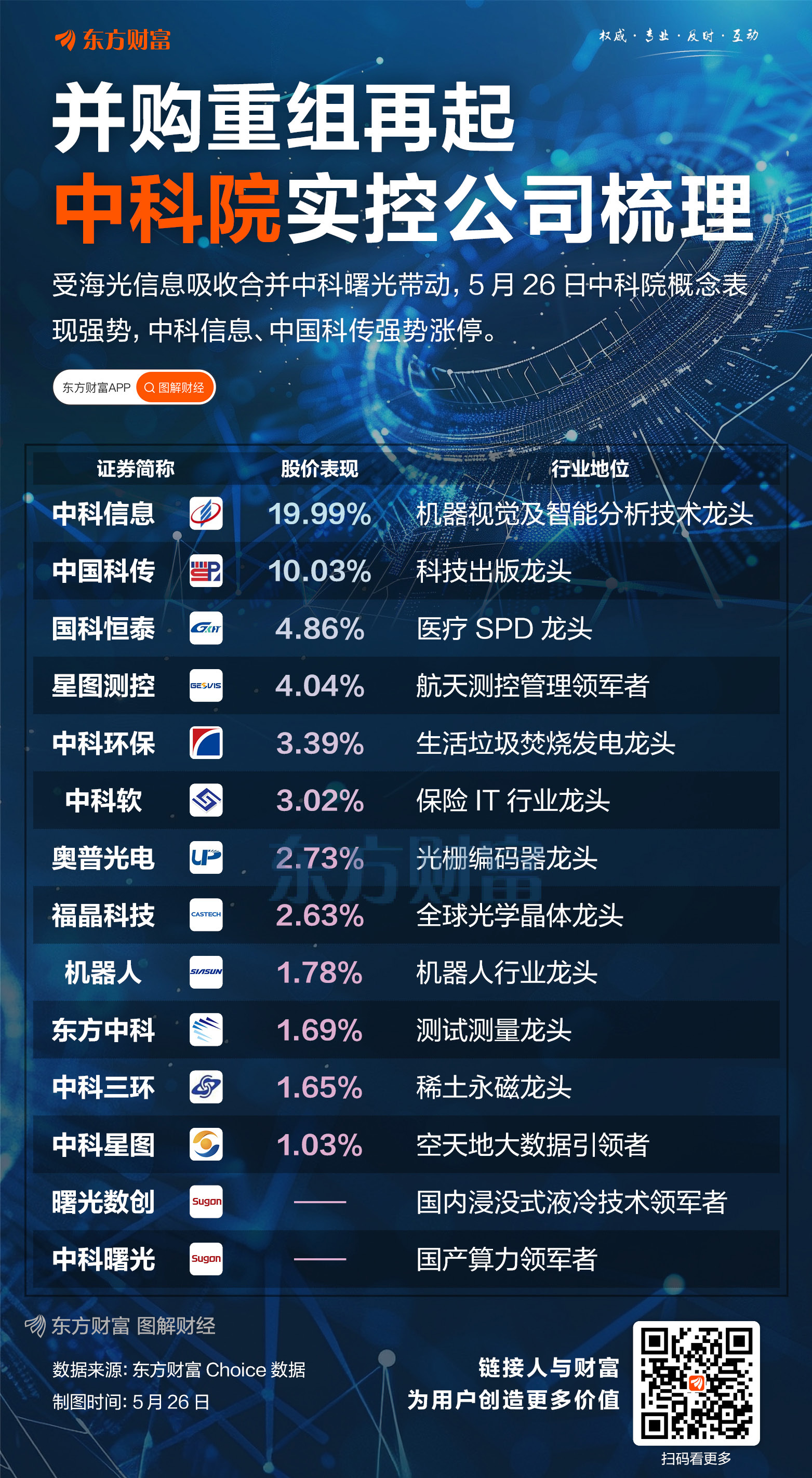 5月26日,中科院系概念走强,中科信息、中国科传双双涨停;国科恒泰、星图测控、中科环保等也明显上涨。