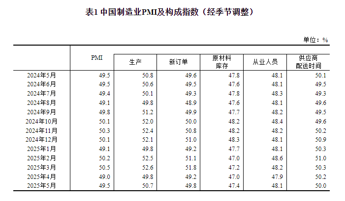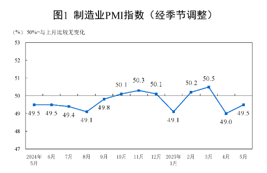 5月份,制造业采购经理指数为49.5%,比上月上升0.5个百分点;非制造业商务活动指数为50.3%,比上月下降0.1个百分点;综合PMI产出指数为50.4%,比上月上升0.2个百分点,我国经济总体产出保持扩张。