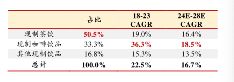 据行业数据,现制咖啡在整体咖啡市场中的占比持续提升:2023年占40.2%,2024年预计达44.6%。而在现制饮品市场中,现制咖啡增速最快。浙商证券2025年3月发布的研报显示,预计在2024年到2028年,现制咖啡的复合年增长率将达18.5%,超过现制茶饮(16.4%)以及其他现制饮品(13.5%)。