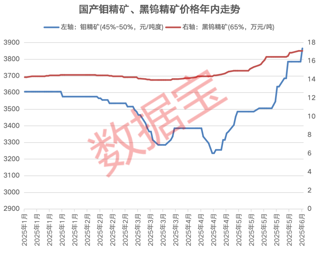 今年以来,多个小金属品种价格轮番上涨。安泰科数据显示,截至6月5日,国产钼精矿(45%—50%品位)价格达到3865元/吨度,较年内3235元/吨度的低点上涨超18%。黑钨精矿价格最新达到17.1万元/吨,持续创下历史新高,较去年年末上涨20%,此外还有锑、铋等金属价格实现大幅上涨。