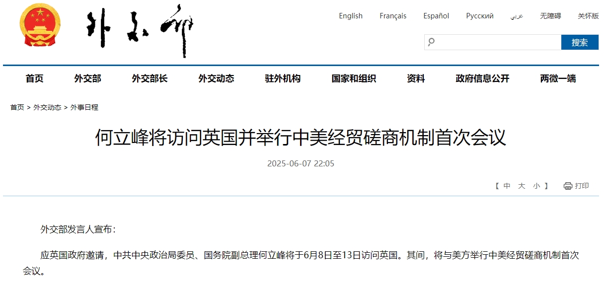 应英国政府邀请,中共中央政治局委员、国务院副总理何立峰将于6月8日至13日访问英国。其间,将与美方举行中美经贸磋商机制首次会议。