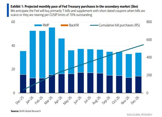 根据巴克莱的估计,美联储2026年购买的国库券规模或将接近5250亿美元,远超其此前预测的3450亿美元。该机构预计美联储自12月份起每月将购买约550亿美元,并将在第一季度保持这一高位数字,然后在4月份将购买规模下调至预计每月250亿美元——这一数字也将高于其此前预测的每月150亿美元。