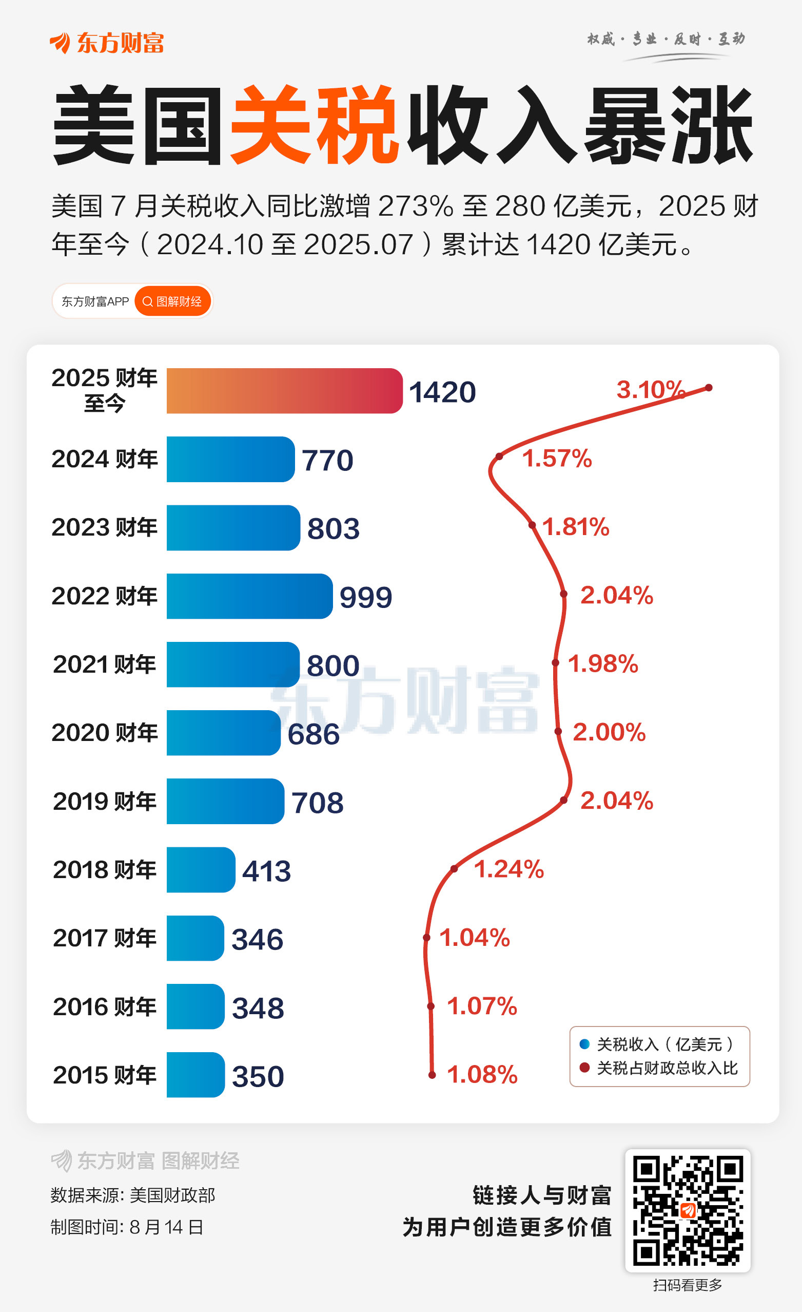 美国财政部于当地时间12日发布的数据显示,美国7月单月关税收入同比激增273%至280亿美元。2025财年(去年10月1日至今)累计关税收入已达1420亿美元,占美国财政总收入的3.1%,关税金额及收入占比均创有数据以来的新高。